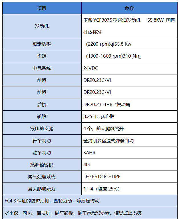 6. 配套國四排放標(biāo)準(zhǔn)的玉柴發(fā)動(dòng)機(jī),四輪液壓驅(qū)動(dòng)行走系統(tǒng),可實(shí)現(xiàn)無級(jí)變速,爬坡能力強(qiáng);